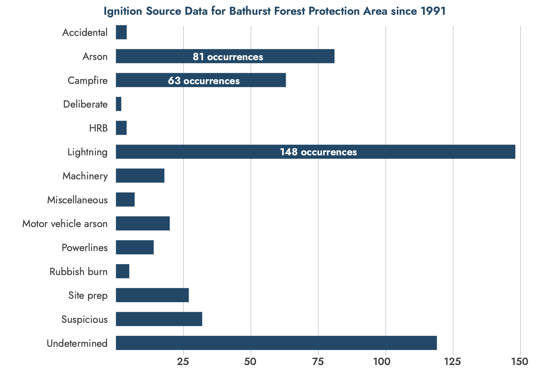 Forestry Corporation of NSW keeps records of ignition sources for forest fires. Over the last 33 years, the three biggest identified sources of ignition are lightning, arson and campfire.